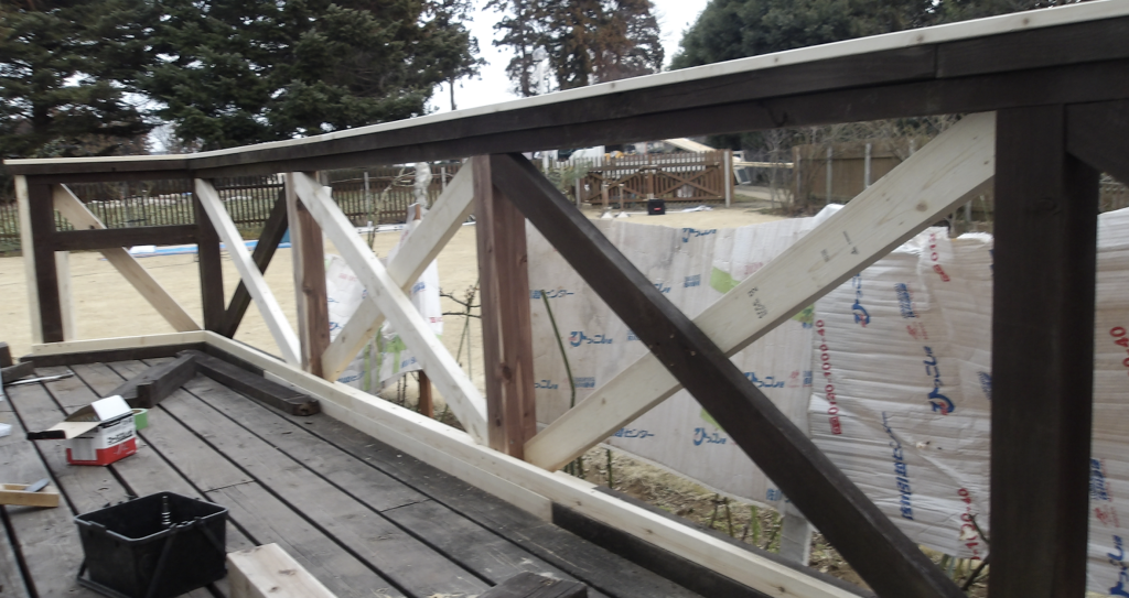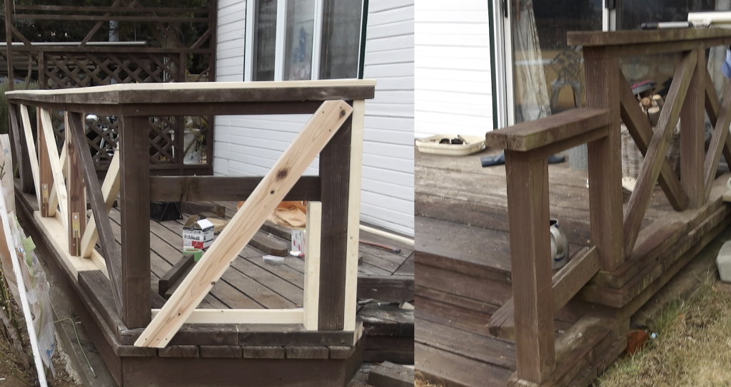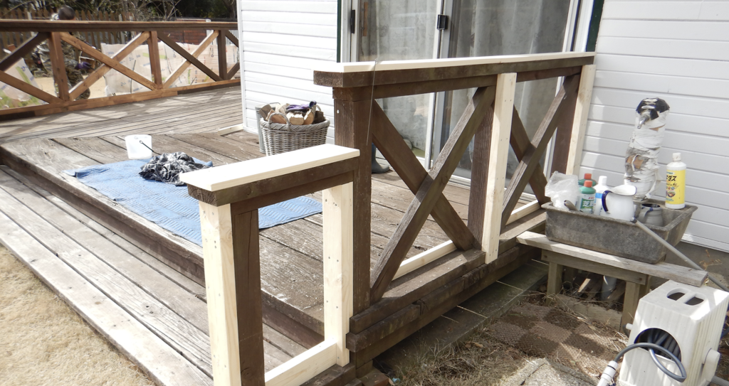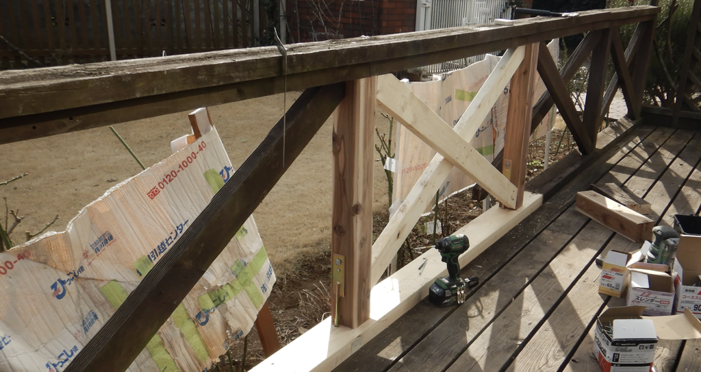 ウッドデッキ 筋交いフェンス 枠・柱傷んだ部分を交換修理 工事完了2