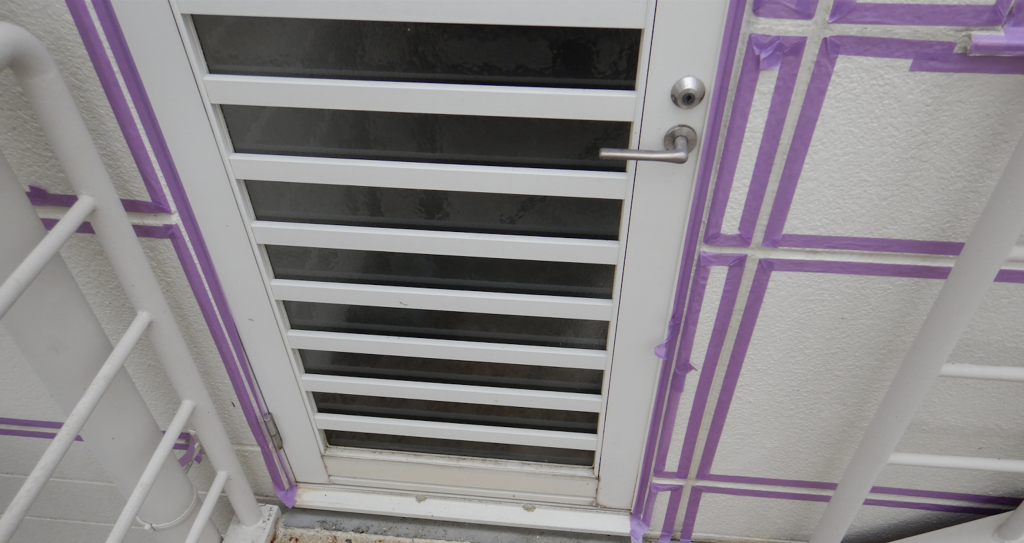 外階段ドア廻り目地 シール用テーピング養生作業状況