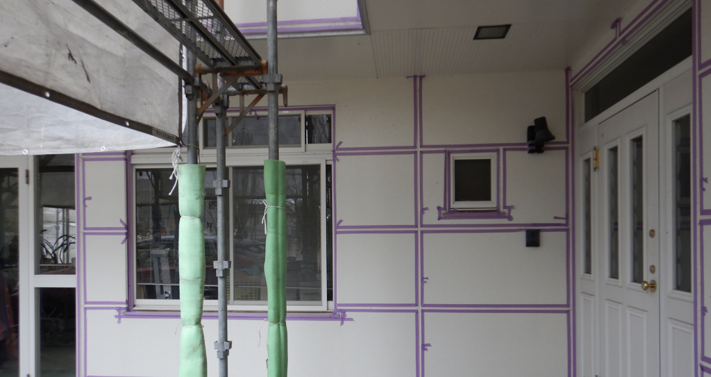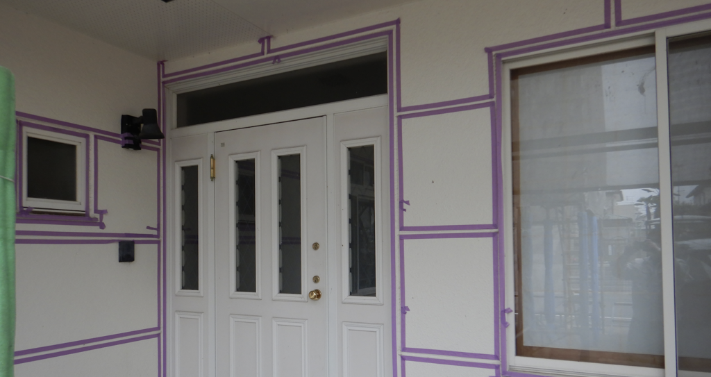 外壁 玄関廻り目地シール用テーピング養生作業状況1
