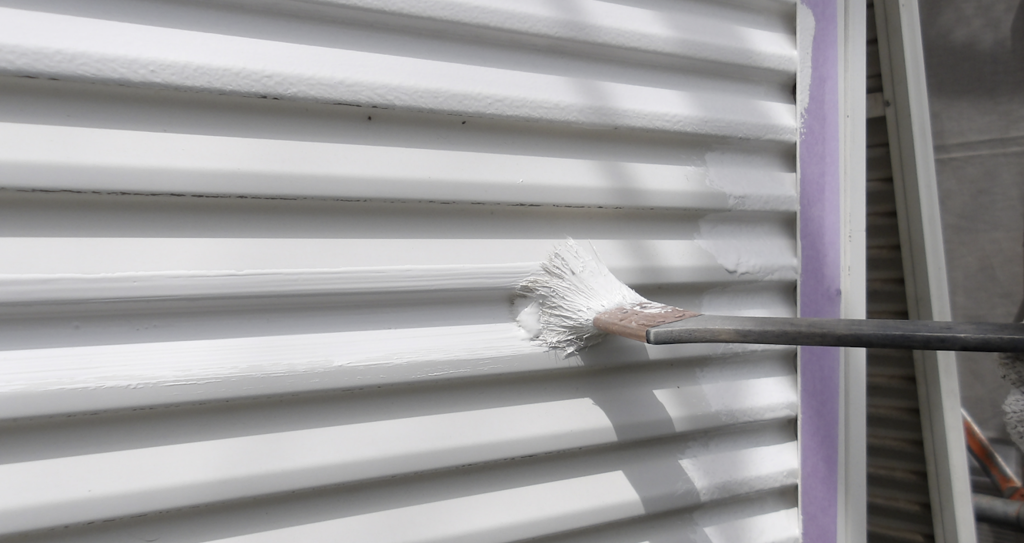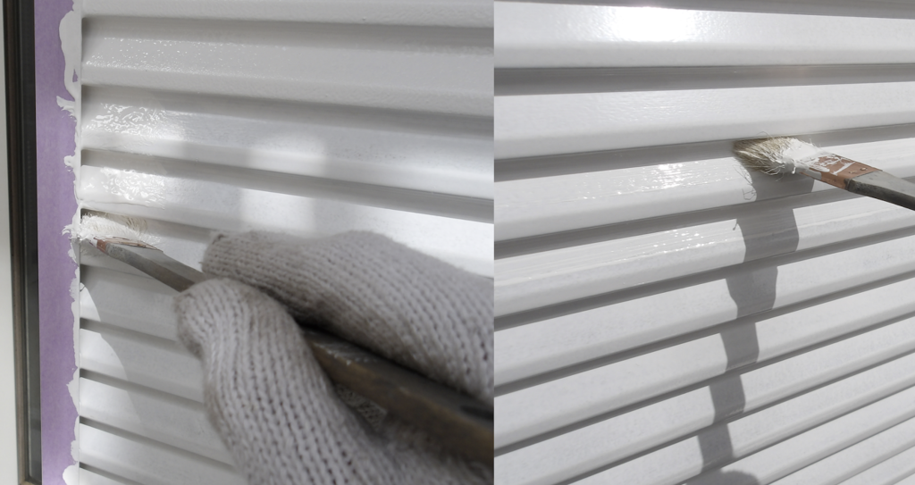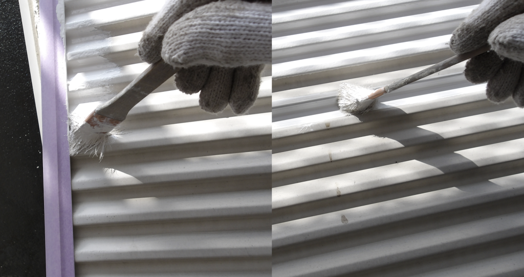 戸袋雨戸 鉄部面(ガラリ)上塗り塗装刷毛塗り作業状況