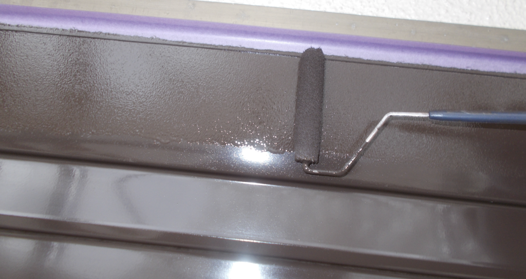 雨戸鉄部面塗装 上塗り塗装 ローラー塗り作業状況